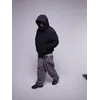 Умеренный оверсайз фит, отстегивающийся капюшон, широкая резинка по низу куртки.