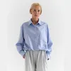 Укороченная рубашка с карманом на груди и кулисой по низу, застежка на пуговицы спереди.